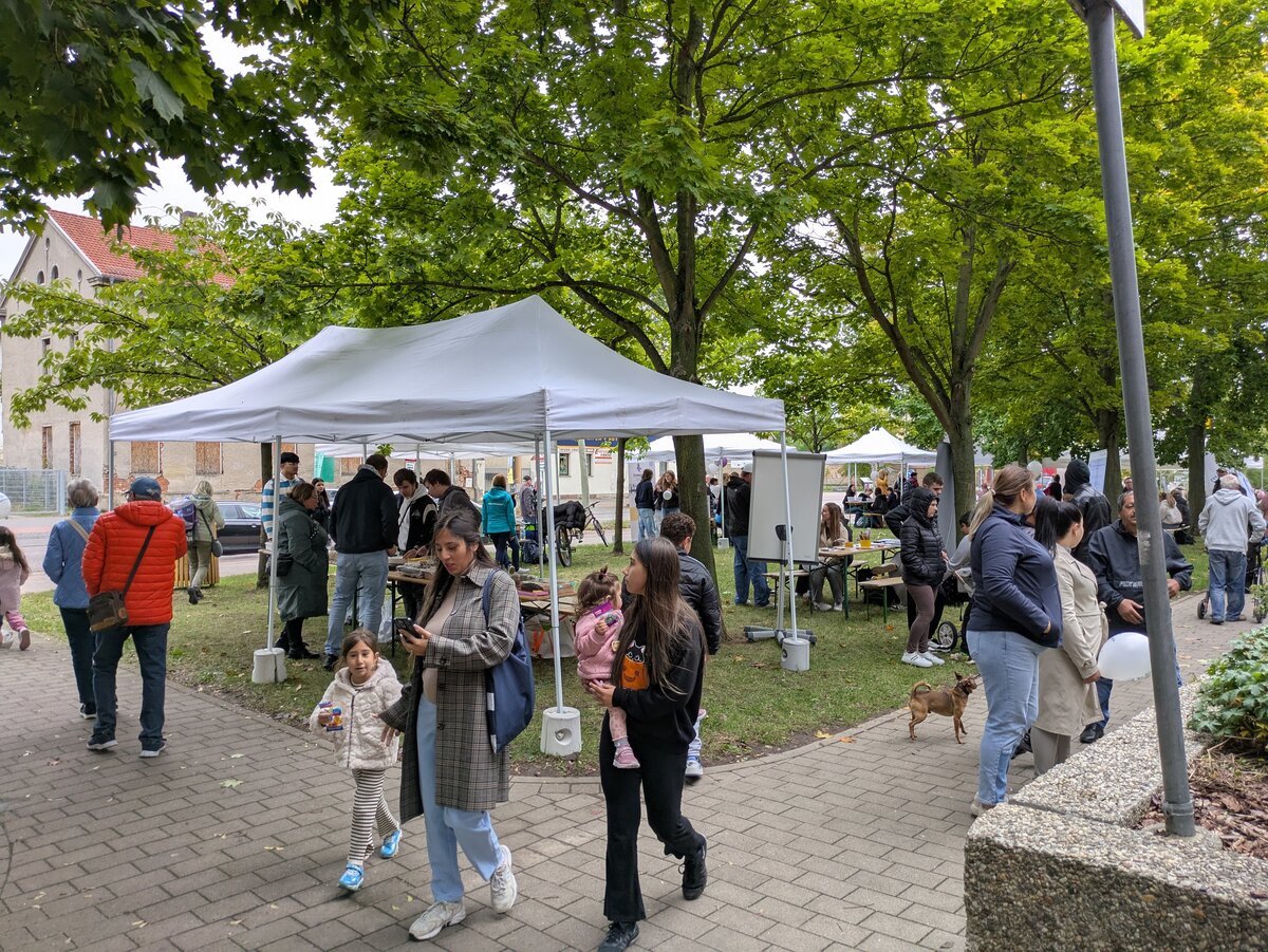 Großer Andrang herrschte beim Neustadtfest am 26. September 2025. Die 6. Auflage des Stadtteilfestes war ein voller Erfolg und damit ein echter Höhepunkt der diesjährigen „Interkulturellen Woche“. Aufgrund der Bauarbeiten am Abenteuerspielplatz im Neustadtpark kehrte das Neustadtfest zu seinen Wurzeln zurück und fand vor dem Neustadtbüro am Neumarkt 6 statt. Das Angebot war dennoch genauso vielfältig wie in den Vorjahren. Zahlreiche Träger, Einrichtungen, Vereine und Aktive der Stadt beteiligten sich an dem Event. An mehr als 20 Ständen gab es Mitmach-Angebote und Aktionen für die Besucherinnen und Besucher. Aufgrund des begrenzten Platzangebotes wurde in diesem Jahr zwar auf Karusselle verzichtet, aber für Kinder gab es dank Bastelstraße, Handwerker-Aktion, Schminktisch, Schnupperangeln, Tattoo-Station und vielem mehr trotzdem jede Menge zu entdecken. Zum Programm gehörten zudem Live-Musik, Gesang und Show-Tanz. Selbst vom einsetzenden Regen in den letzten beiden Stunden ließen sich die kleinen und großen Talente nicht aufhalten und sorgten mit ihren Auftritten für Unterhaltung.