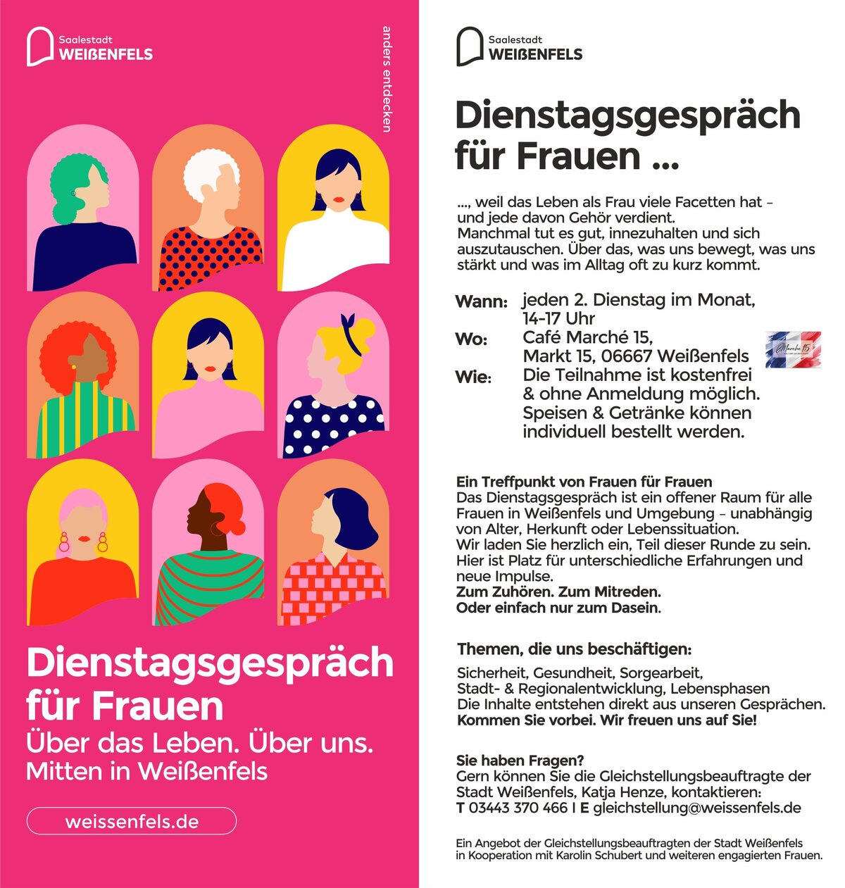 Zu den „Dienstagsgesprächen“ sind Frauen aus Weißenfels und Umgebung künftig eingeladen. Hinter dem Titel verbirgt sich ein neues, offenes Begegnungs- und Beteiligungsangebot für Frauen, das ab sofort jeden zweiten Dienstag im Monat, von 14 bis 17 Uhr im Café Marché 15, am Markt 15 in Weißenfels stattfindet. Los geht es am 10. Februar 2026. Es gibt die Möglichkeit zum offenen Kommen und Gehen. Die Teilnahme ist kostenfrei. Eine Anmeldung ist nicht notwendig. Die Organisation und Moderation der Treffen übernehmen die Unternehmerin Karolin Schubert und die Gleichstellungsbeauftragte der Stadt Weißenfels Katja Henze. Zivilgesellschaftliches Engagement und kommunale Gleichstellungspolitik kommen hier zusammen.