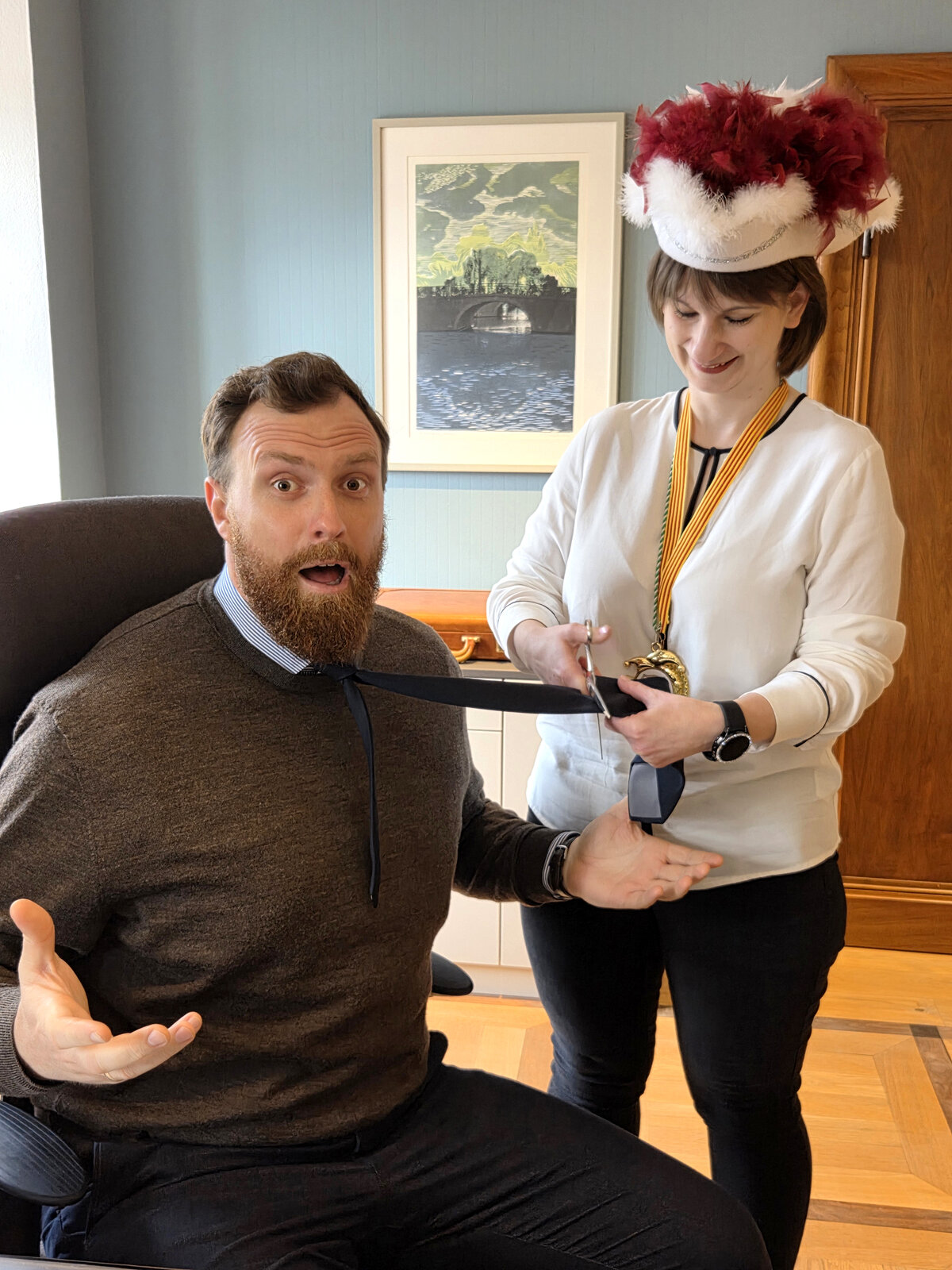 Wenn die Leiterin des Weißenfelser Rechnungsprüfungsamtes Mitglied im Karnevalsverein ist, bleibt auch der Oberbürgermeister nicht vor närrischen Traditionen verschont. So rückte Winnie Artopee am 12. Februar 2026 mit Schere im Weißenfelser Rathaus an und schnitt ihrem Chef Martin Papke kurzerhand die Krawatte ab. Die Prüferin ist seit vielen Jahren bei den „Kessen Miezen“ des Lobitzscher Kultur- und Traditionsvereins aktiv. Den Karneval feiert der Verein in diesem Jahr mit gleich vier Samstagsveranstaltungen im Februar, die allesamt ausverkauft sind.