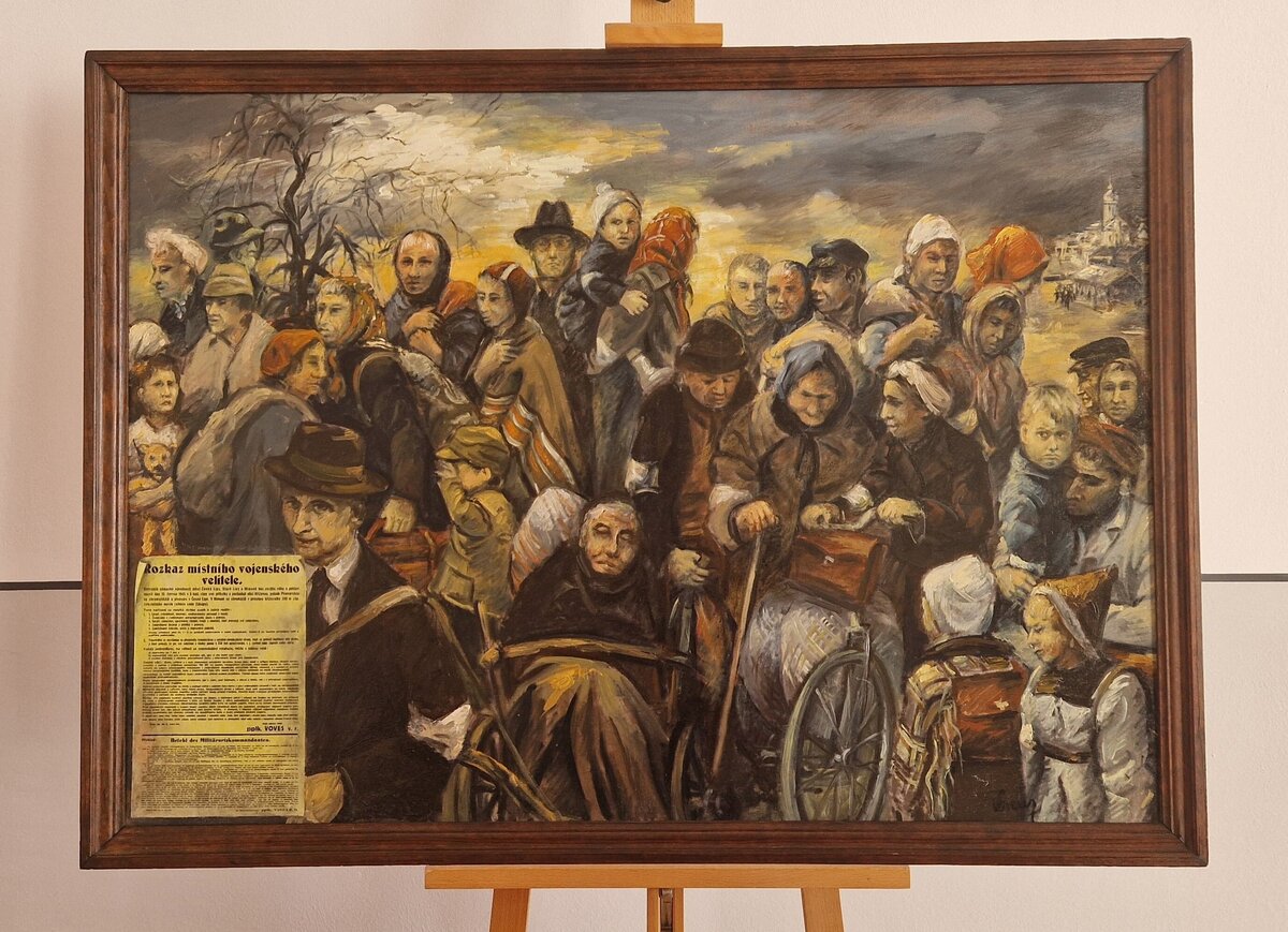 Das kleinere, 70 Zentimeter breite und 80 Zentimeter hohe Bild zeigt das Institut für Lederverarbeitung in Weißenfels, wo Wilfried Schreier über lange Jahre arbeitete. „Zug der Vertriebenen“ ist der Titel des zweiten Kunstwerks. Das 116 Zentimeter breite und 86 Zentimeter hohe Ölgemälde erinnert an die Geschehnisse nach dem Ende des Zweiten Weltkriegs auf dem Gebiet der damaligen Tschechoslowakei. „Mein Vater wurde 1931 in dem böhmischen Grenzdorf Görsdorf im damaligen Kreis Reichenberg geboren“, sagte Matthias Schreier bei der Übergabe. „Er kam im Spätsommer 1945 nach Merseburg und 1956 nach Weißenfels.“