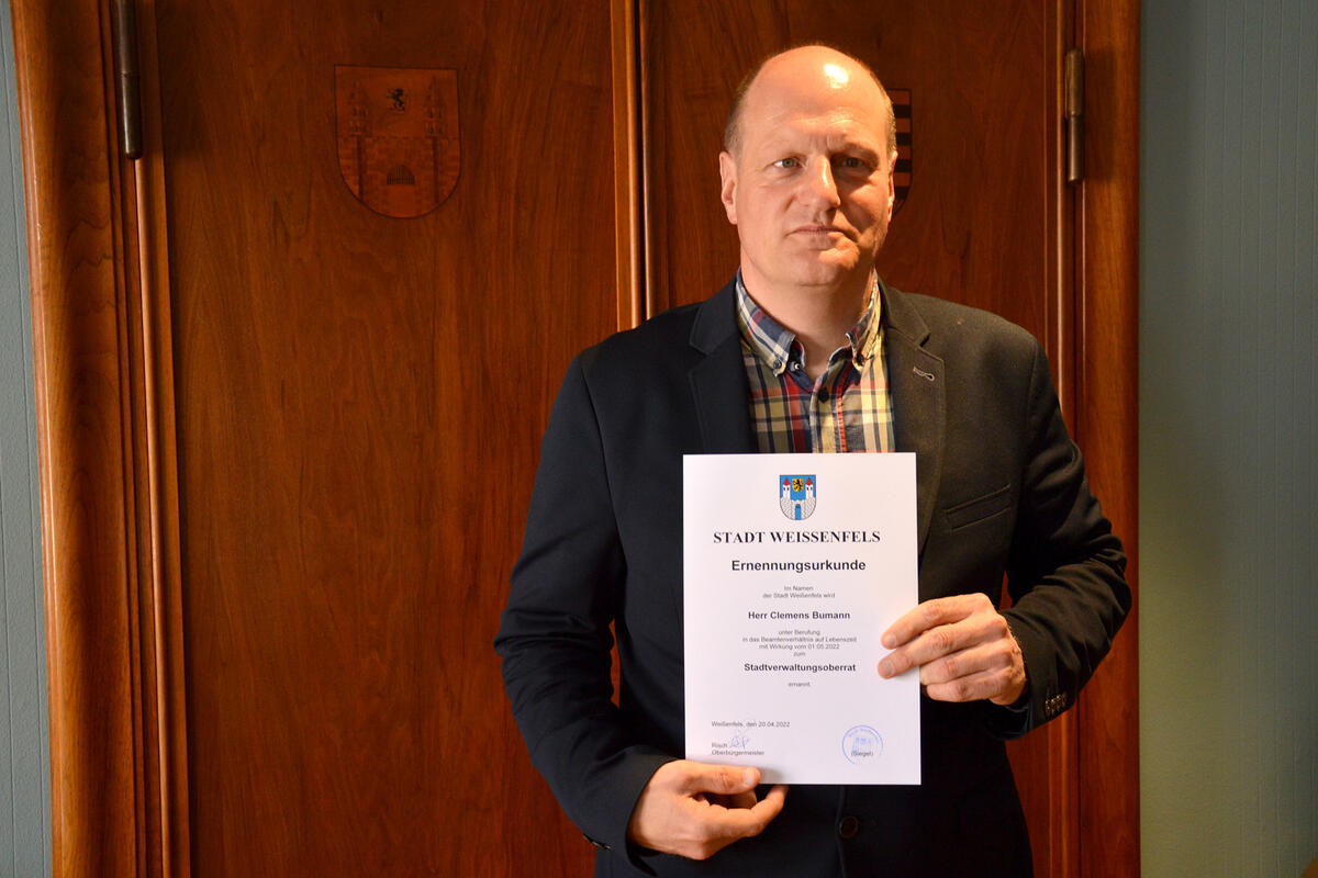 Clemens Bumann ist ab 1. Mai 2022 der neue Leiter des Fachbereichs Technische Dienste und Stadtentwicklung der Stadt Weißenfels. Oberbürgermeister Robby Risch hat ihm am 20. April 2022 die Ernennungsurkunde überreicht. Clemens Bumann hat daraufhin den Amtseid geleistet und wurde damit ins Beamtenverhältnis übernommen. Clemens Bumann war bisher als Bauamtsleiter der Stadt Rotenburg (Niedersachsen) tätig.