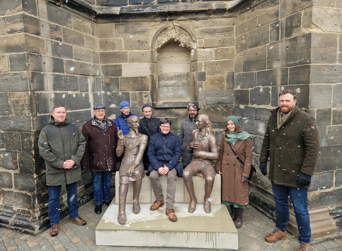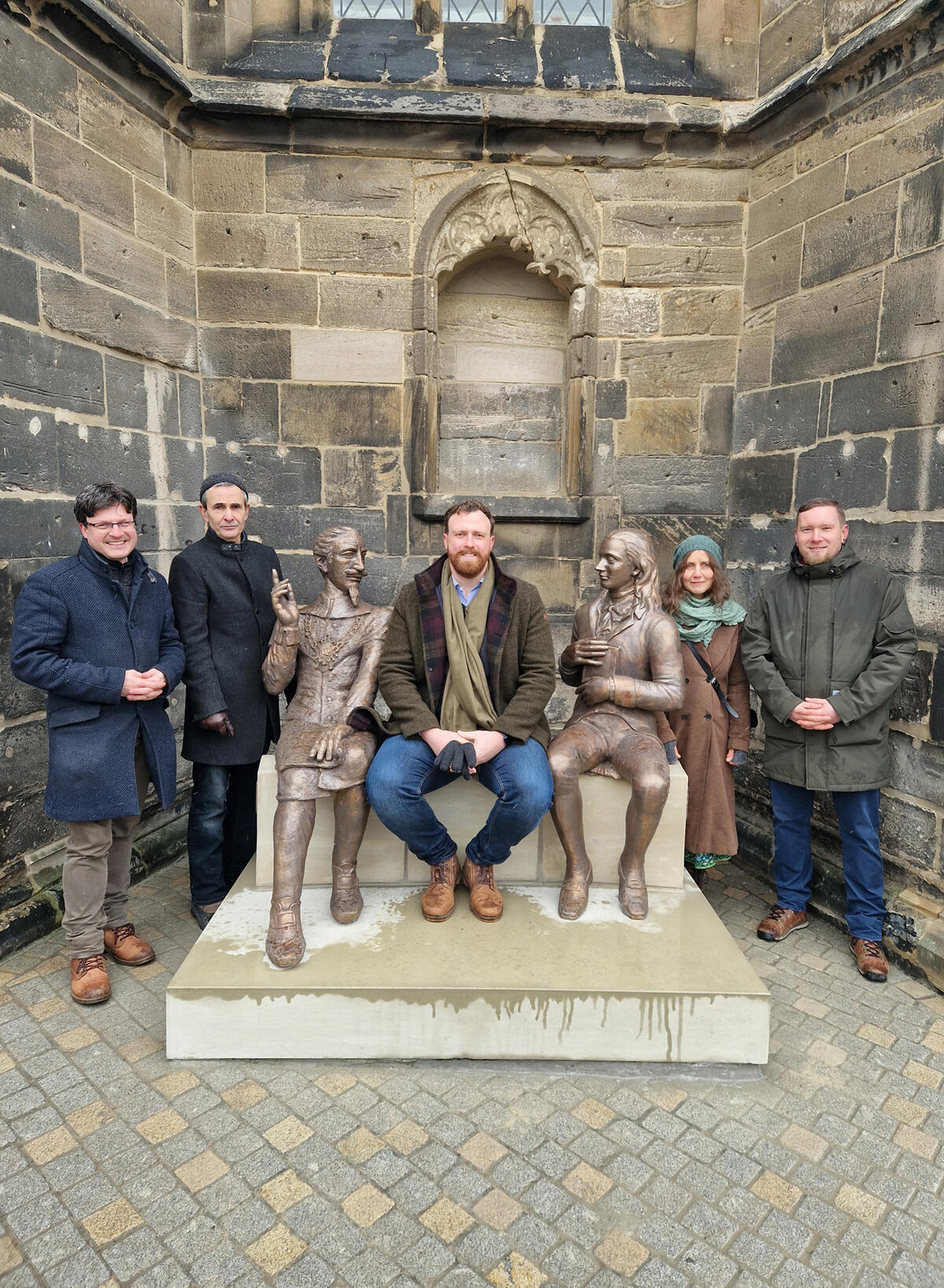 Die Bank hat das Potential, ein beliebtes Fotomotiv zu werden. Zu sehen sind lebensgroße Bronzefiguren des altehrwürdigen Heinrich Schütz und des jungen Friedrich von Hardenberg alias Novalis. Beide sitzen einander zugewandt und treten miteinander in den Dialog. Ein Szenario, das im wahren Leben nie hätte stattfinden können, schließlich lebten der Komponist und der Dichter in unterschiedlichen Jahrhunderten. Bürgerinnen und Bürger können zwischen den beiden berühmten Söhnen der Stadt Platz nehmen, Fotos machen oder einfach nur eine kleine Ruhepause genießen.