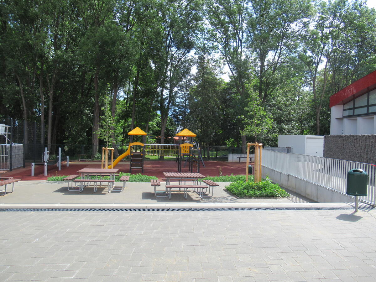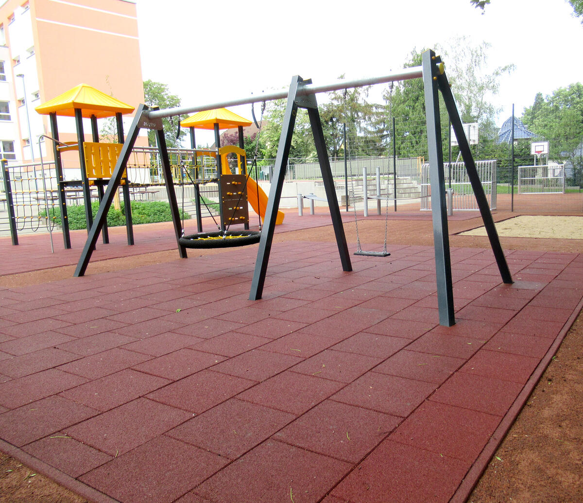 Sehen lassen kann sich auch das neue Außengelände der Grundschule am Kirschweg. Sämtliche Flächen und Wege wurden neu gepflastert und bepflanzt. Auf dem Pausenhof dürfen sich die Kinder über ein sechseckiges Klettergerüst, einen Rutschturm, eine Balancier-Matte und viele andere spannende Elemente freuen. Außerdem gibt es einen kombinierten Fußball- und Basketballplatz. Mittelpunkt ist ein Atrium als Ort für Sport, Spiel und Versammlungen.