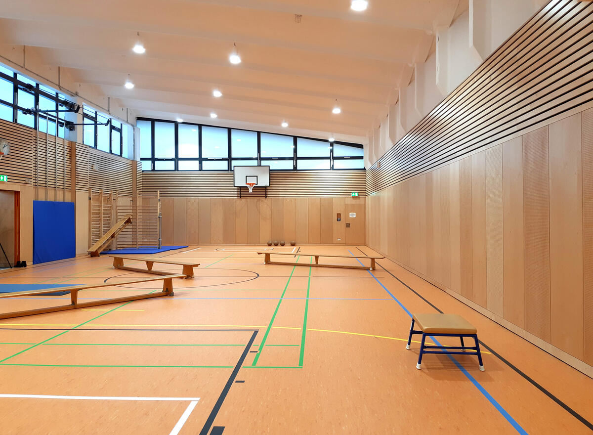 Schmuckstück der Turnhalle ist das neue Sportfeld. Die Arbeiter haben einen Sport-Schwing-Boden verlegt, der durch seine Dämpfeffekte die Gelenke der Kinder schont. An den Wänden befinden sich Multiplexplatten aus Birkenholz mit Prallschutz- und Schallschutzfunktion. Die Sporthalle verfügt zudem über mehrere Basketballkörbe und zwei Gerätekammern. Kletterstangen und Sprossenwände verschwinden platzsparend als Einbausportgeräte in einem Hohlraum in der Wand. Außerdem wurde das Gebäude im Zuge der Sanierung barrierefrei gestaltet.
