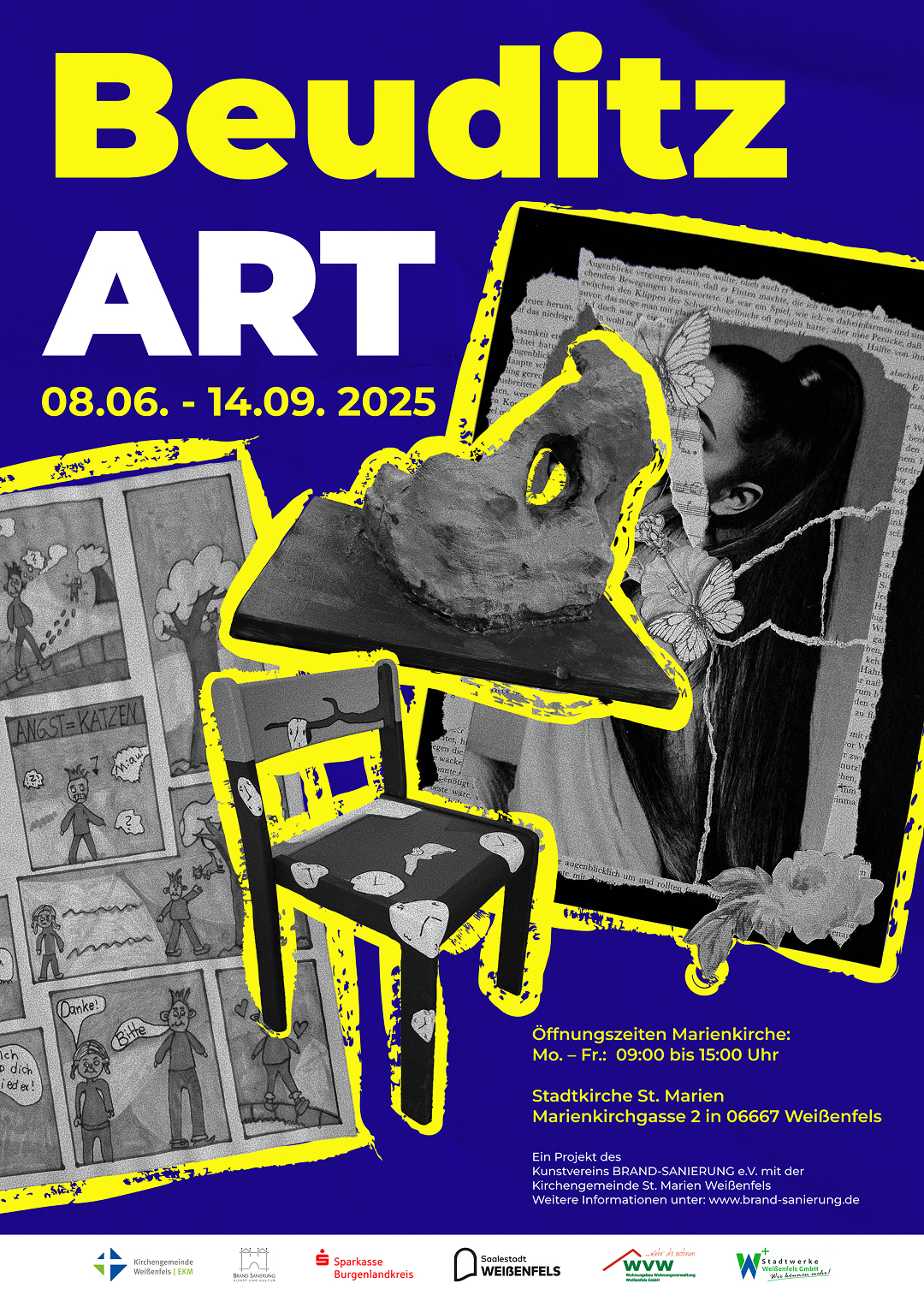 Der Weißenfelser Kunstverein Brandsanierung fördert seit vielen Jahren die Kinder- und Jugendkunst im Burgenlandkreis. Höhepunkte waren bisher die beiden Kinder- und Jugendtriennalen in den Jahren 2018 und 2023. Für die Stadt Weißenfels wurde zudem die Tradition entwickelt, dass in regelmäßigen Abständen Schulen eingeladen sind, hervorragende Schülerarbeiten aus dem Kunstunterricht öffentlich auszustellen. Nach der Neustadtschule und dem Goethegymnasium nutzt in diesem Jahr die Beuditzschule diese Gelegenheit. Die besten Kunstwerke von Schülerinnen und Schülern aus dem Schuljahr 2024/2025 werden vom 8. Juni bis 14. September 2025 in der St. Marienkirche ausgestellt. Zu den Öffnungszeiten der „Offenen Kirche“ können die Arbeiten von montags bis freitags von 9 bis 15 Uhr besichtigt werden. Nach telefonischer Vereinbarung im Gemeindebüro können auch individuelle Termine vereinbart werden: 03443 302082.