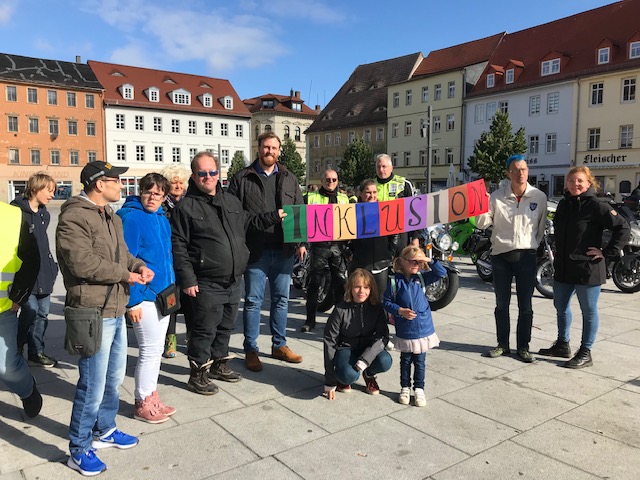 Etwa 30 Motorräder parkten am 18. September 2022 auf dem Weißenfelser Marktplatz – und das für einen guten Zweck. Im Rahmen des Aktionsmonats zum Europäischen Protesttag von Menschen mit Behinderung warben die Fahrerinnen und Fahrer für Inklusion. Die Behindertenbeauftragte des Burgenlandkreises und ihr Team sowie das Örtliche Teilhabemanagement des Burgenlandkreises haben in Kooperation mit dem Amt für Gleichstellung und Integration der Stadt Weißenfels sowie der Gleichstellungsbeauftragten der Stadt Naumburg die inklusive Bikerausfahrt organisiert. Der Weißenfelser Oberbürgermeister Martin Papke gab für die Motorradfreunde Mitteldeutschland den Startschuss.