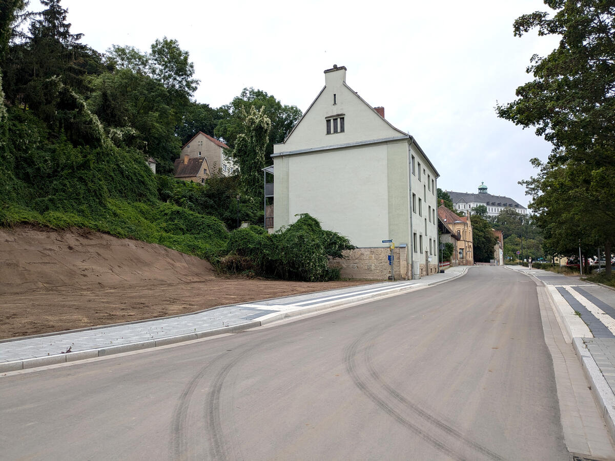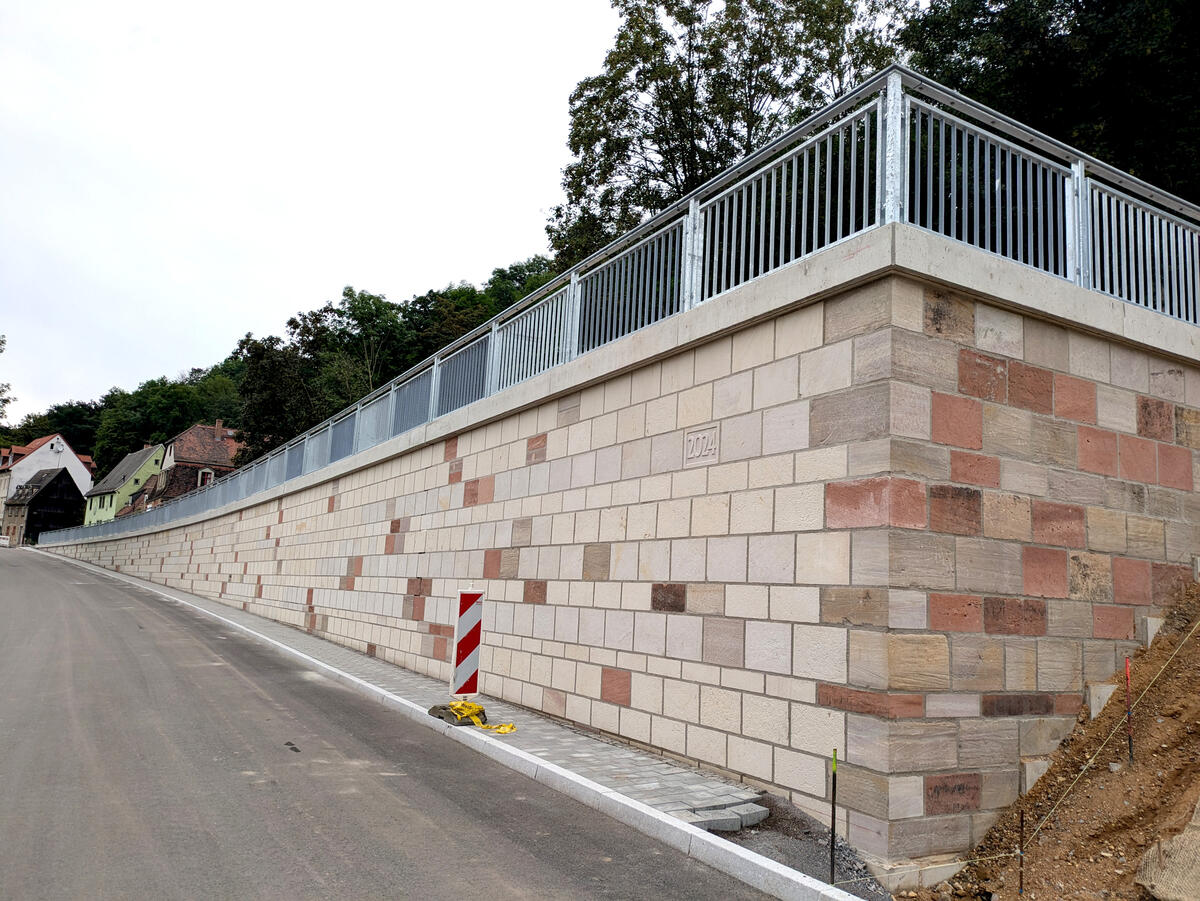 Im Rahmen der Baumaßnahme wurde zudem ein 100 Meter langer Abschnitt der Hohen Straße ausgebaut und die dortige Stützwand erneuert. Hier fanden ebenfalls Kanal- und Straßenbauarbeiten statt. Die Straßenoberfläche besteht nun aus Naturstein-Großpflaster, welches aus der Straße Am Güterbahnhof entnommen wurde. An der Stützmauer erfolgten zunächst Betonbauarbeiten. Danach wurde diese mit Sandstein verblendet, wobei der Steinmetz entsprechend der Denkmalschutzauflagen auch rote Steine der alten Mauer mit verwendet hat. Auf diese Weise ist ein ansprechendes Muster entstanden. In den kommenden Tagen werden bei laufendem Verkehr noch die Bewegungsfugen der Mauer hergestellt.