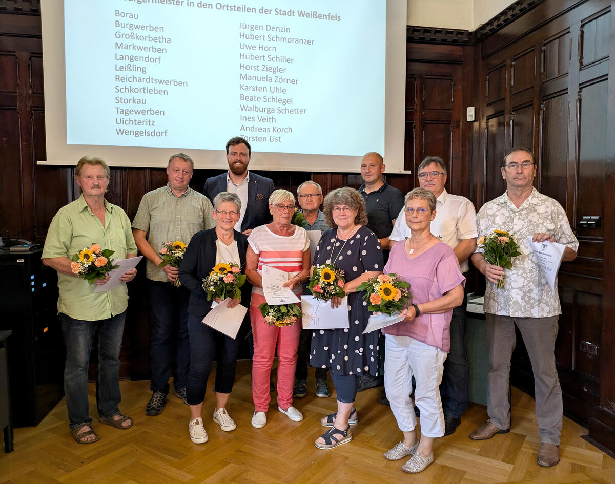 Oberbürgermeister Martin Papke eröffnete die Sitzung mit einer Schweigeminute für die drei Jugendlichen, die Anfang Juli bei einem Autounfall nahe Schönburg ums Leben kamen. Im Anschluss ernannte er die Ortsbürgermeisterinnen und Ortsbürgermeister. Diese wurden zuvor in den jeweiligen Sitzungen der Ortschaftsräte in dieses Amt gewählt. Als bisherige Amtsinhaber wurden Jürgen Denzin (Borau), Hubert Schmoranzer (Burgwerben), Horst Ziegler (Langendorf), Hubert Schiller (Markwerben), Karsten Uhle (Reichardtswerben), Beate Schlegel (Schkortleben), Walburga Schetter (Storkau), Ines Veith (Tagewerben), Andreas Korch (Uichteritz) und Torsten List (Wengelsdorf) wiedergewählt. Uwe Horn ist neuer Ortsbürgermeister in Großkorbetha und Manuela Zörner übernimmt dieses verantwortungsvolle Ehrenamt ab sofort in Leißling. Jürgen Denzin und Karsten Uhle waren verhindert und konnten an der Stadtratssitzung nicht teilnehmen.