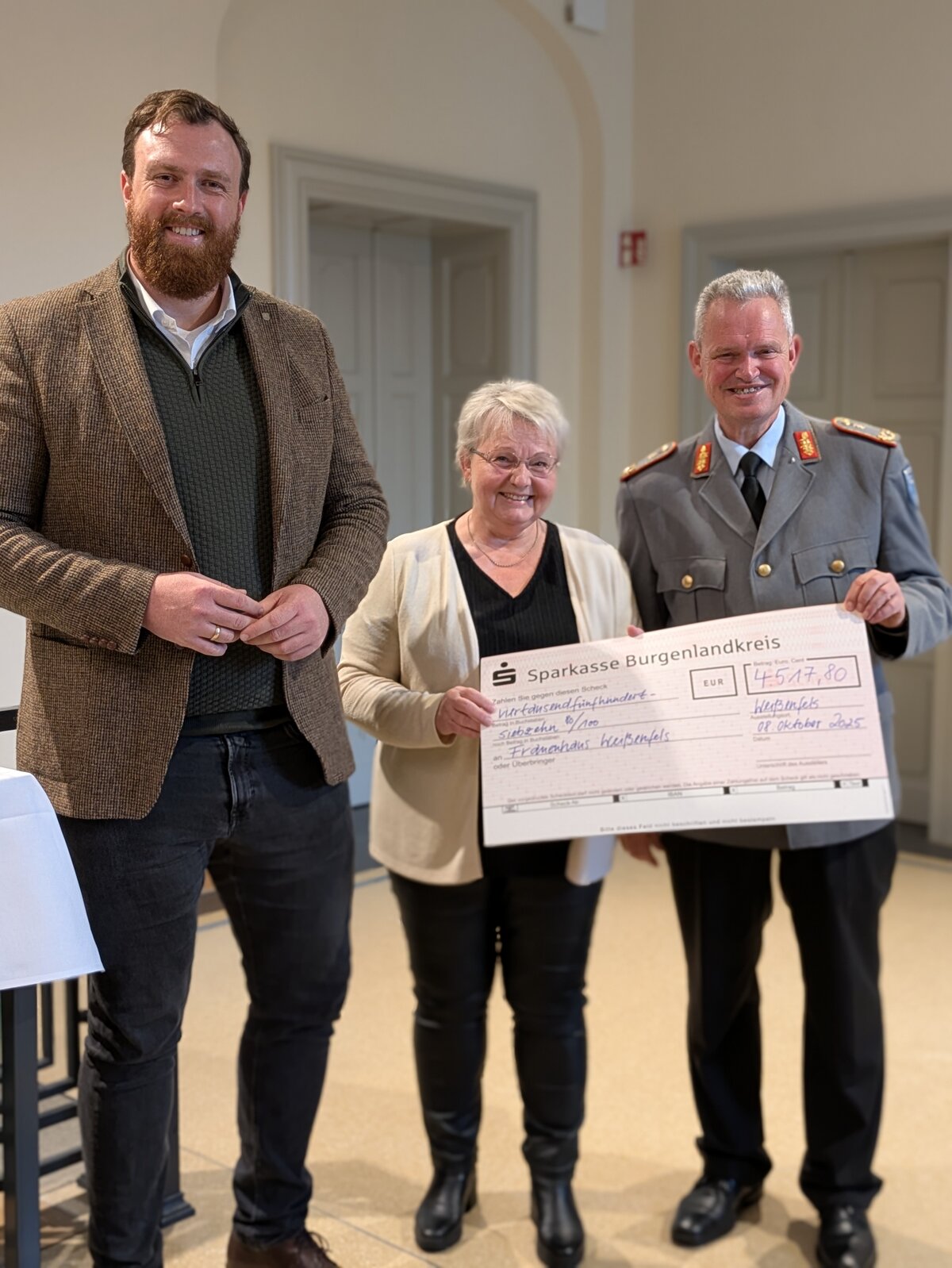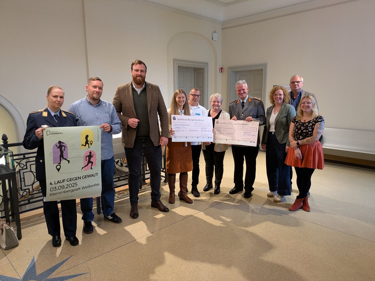 Der Weißenfelser „Lauf gegen Gewalt“ fand in diesem Jahr unter dem Motto „häusliche Gewalt“ statt. Mehr als 9.000 Euro wurden bei der Benefizveranstaltung eingenommen. Das Geld überreichten Oberbürgermeister Martin Papke und der Kommandeur des Kommandos Sanitätsdienstliche Einsatzunterstützung Generalarzt Dr. Bruno Most am 8. Oktober 2025 als Spende an den Frauenhausverein e.V. Weißenfels und die Opferberatungsstelle „Weißer Ring“.