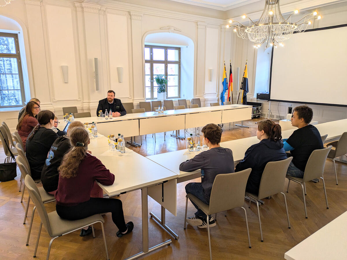 Einen Termin beim Oberbürgermeister hatten am 22. Oktober 2024 Schülerinnen und Schüler der Weißenfelser Schlossgartenschule. Sie ließen sich von Martin Papke das Rathaus zeigen. Dabei erkundeten sie unter anderem den Sitzungssaal und das Büro des Stadtoberhauptes. Martin Papke nahm sich viel Zeit für die sieben Jugendlichen und deren Lehrerinnen. Er erklärte ihnen die verschiedenen Aufgaben innerhalb der Stadtverwaltung und erzählte aus seinem Alltag als Oberbürgermeister. Auch die Fragen der Mädchen und Jungen beantwortete er. So berichtete er beispielsweise von seinem ersten Tag im Rathaus und von seinen Ideen für die Saalestadt. Auch die wertvolle Amtskette, welche Martin Papke nur bei offiziellen Anlässen und wichtigen Veranstaltungen trägt, durften die Jugendlichen begutachten. Kuriositäten und historische Schätze präsentierte das Stadtoberhaupt zudem in seinem Büro. So befinden sich dort unter anderem eine zugemauerte Tür und ein altes Rednerpult des Weißenfelsers Robert Rosalsky, der mit seinem Tatendrang einst den Weißenfelser Verschönerungsverein prägte und damit bis heute eine Persönlichkeit mit Vorbildcharakter darstellt.