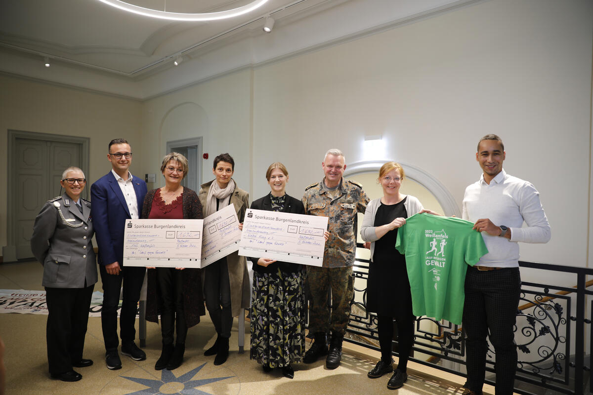 Spenden in Höhe von insgesamt 5.076 Euro wurden bei der Premiere des Weißenfelser „Laufes gegen Gewalt“ am 1. September 2022 eingenommen. Das Geld geht zu gleichen Teilen an die AWO Weißenfels für die Kinder- und Jugendarbeit, den Kinderbauernhof Burgenland und den Weißen Ring e. V. für die Opferberatung. Der stellvertretende Oberbürgermeister Steve Mämecke und der stellvertretende Kommandeur der Sanitätsdienstlichen Einsatzunterstützung Generalarzt Dr. Bruno Most überreichten am 5. Oktober 2022 die drei Spendenschecks an die Begünstigten.