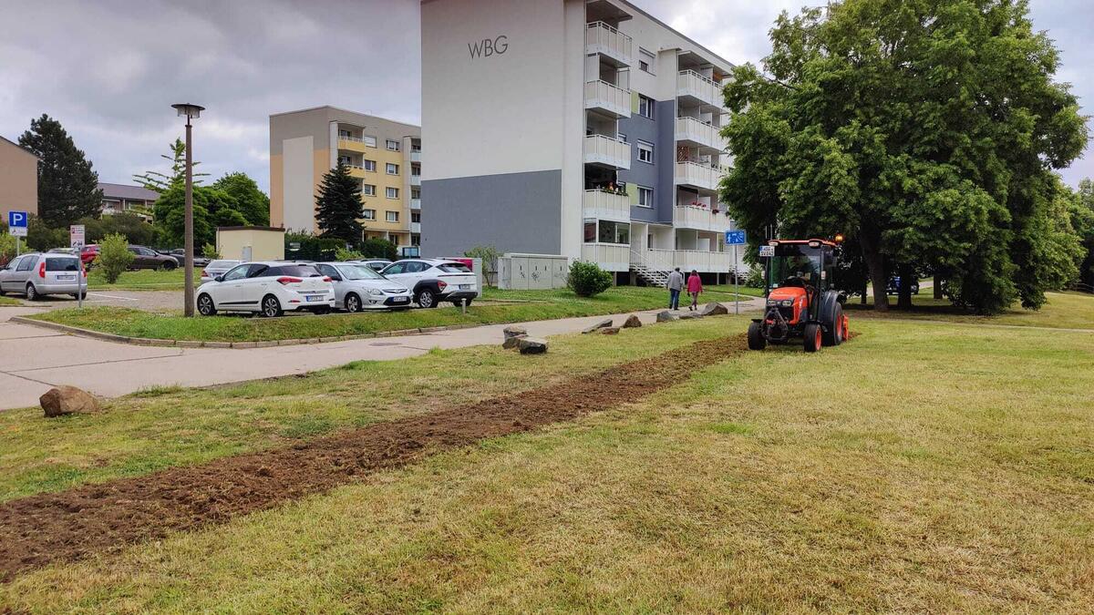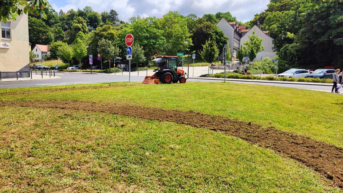 Bei den Grünflächen an der Promenade sowie am Kugelberg handelt es sich aktuell um artenarme, Gräser dominierte Wiesen. Soll es dort zukünftig für die Insekten und Weißenfelser Einwohnerinnen und Einwohner blühen, ist das aktive Einbringen von Pflanzenarten durch eine Einsaat unerlässlich. Doch ohne gut vorbereitetes Saatbeet funktioniert das nicht. Deshalb wird die bestehende Grasnarbe nun im Abstand von etwa vier Wochen dreimal stark durch Fräsen gestört. Für einige Wochen kein schöner Anblick, aber unerlässlich! Im August 2025 wird eine artenreiche, zertifizierte Wildpflanzenmischung eingesät. Diese enthält besonders viele blühende Wildkräuter. Eine bunte, standortangepasste Mischung ausschließlich heimischer Arten, die auch den trockenen Sommern trotzt.