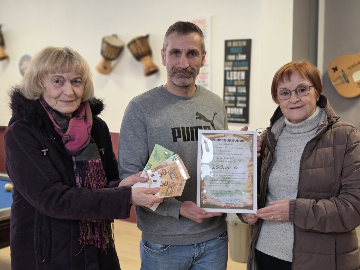 Im Rahmen des Frauen-Lese- und Erzählcafés werden immer Spenden von den Teilnehmerinnen gesammelt. Auch die fünf Veranstaltungen im Jubiläumsjahr 2025 nutzte der Frauenarbeitskreis der Stadt Weißenfels wieder, um Gelder für den guten Zweck zu sammeln. Die Spende kommt dieses Mal dem Jugend- und Familientreff „Die Brücke“ zugute. Insgesamt 250 Euro überreichten Margrit Franke und Sabine Manschatz vom Frauenarbeitskreis am 30. Januar 2026 an Einrichtungsleiter David Knoll.