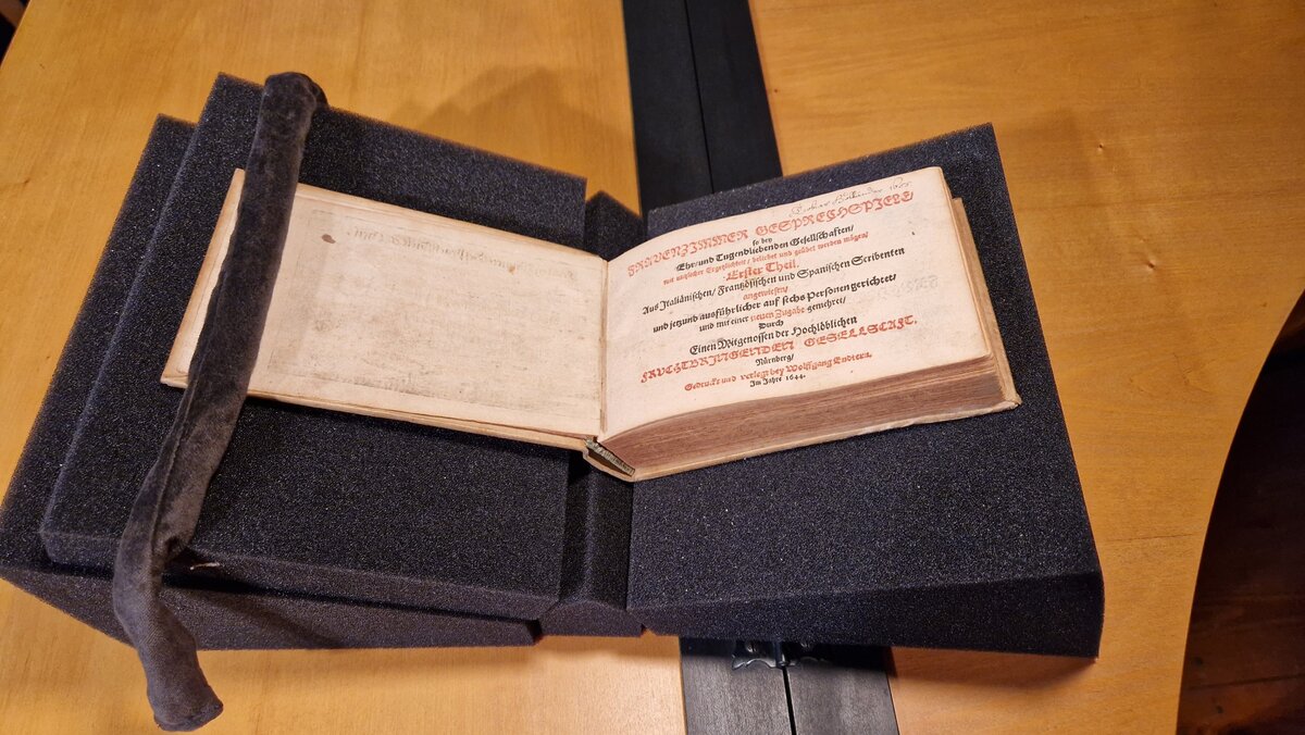 Aufmerksam wurde Dr. Maik Richter auf die von Georg Philipp Harsdörffer und Sigmund Theophil Staden verfassten Bücher durch seine Recherchen für die Sonderausstellung „Die Musen sind weiblich: Frauen der Frühen Neuzeit in Musik, Literatur und bildender Kunst“. Bereits im Jahr 2025 konnte der Förderverein des Heinrich-Schütz-Hauses dank der Unterstützung durch die Fielmann Group AG die Zweitausgabe des zweiten Bandes der Reihe „Frauenzimmer-Gesprechspiele“ erwerben. „Von den acht Bänden haben wir in Weißenfels nun schon zwei“, sagte der promovierte Musikwissenschaftler bei der Übergabe im Heinrich-Schütz-Haus. „Die Frauenausstellung hier im Haus war bisher leider objektfrei. Nach der Wiedereröffnung haben wir authentische Kleinode, die die Präsentation bereichern.“
