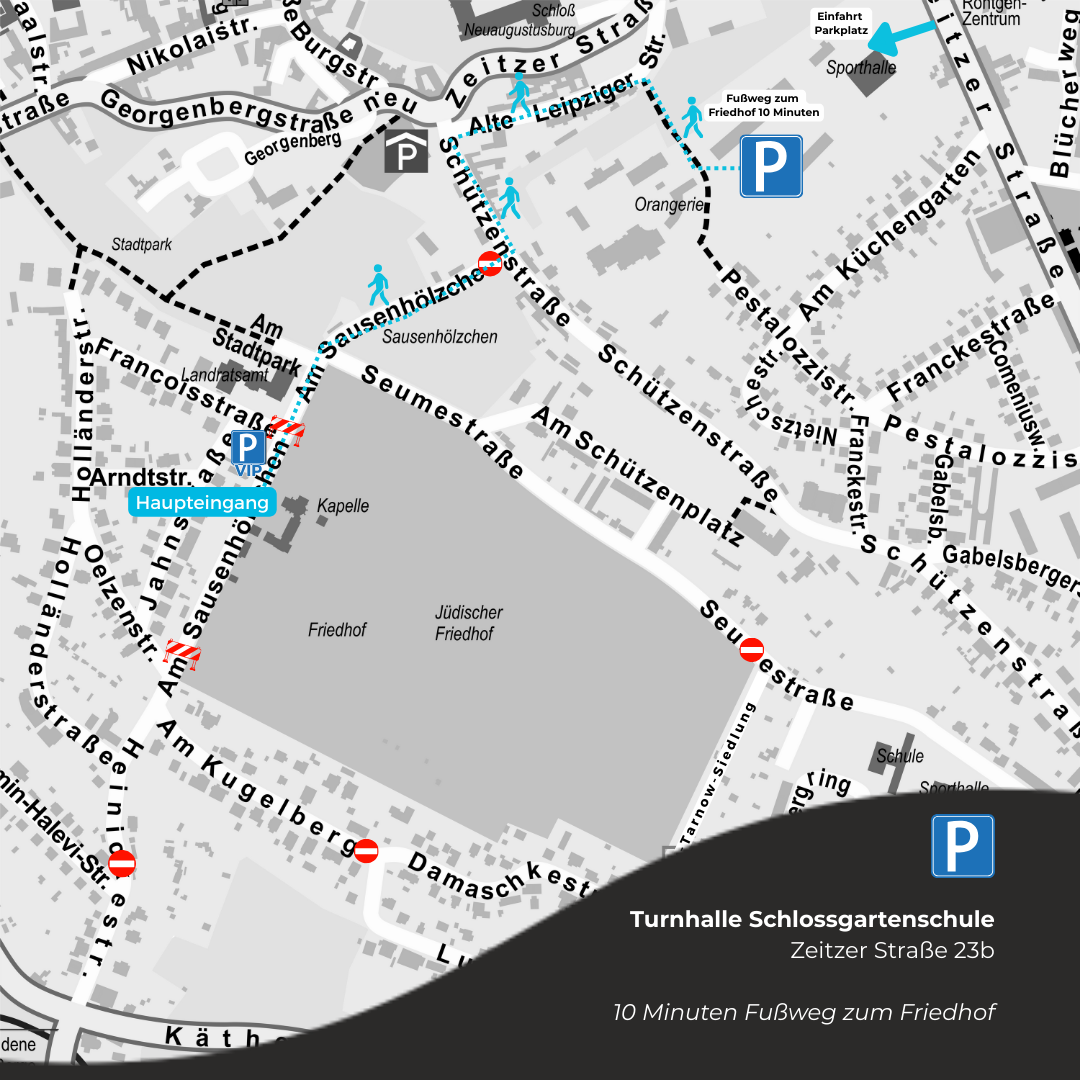 Für Gäste steht der Parkplatz des Landratsamtes im Schlossgartenareal zur Verfügung (Zeitzer Straße 23b). Über den hinteren Ausgang gelangen die Personen zur Alten Leipziger Straße und erreichen zu Fuß innerhalb von etwa zehn Minuten den Friedhof.